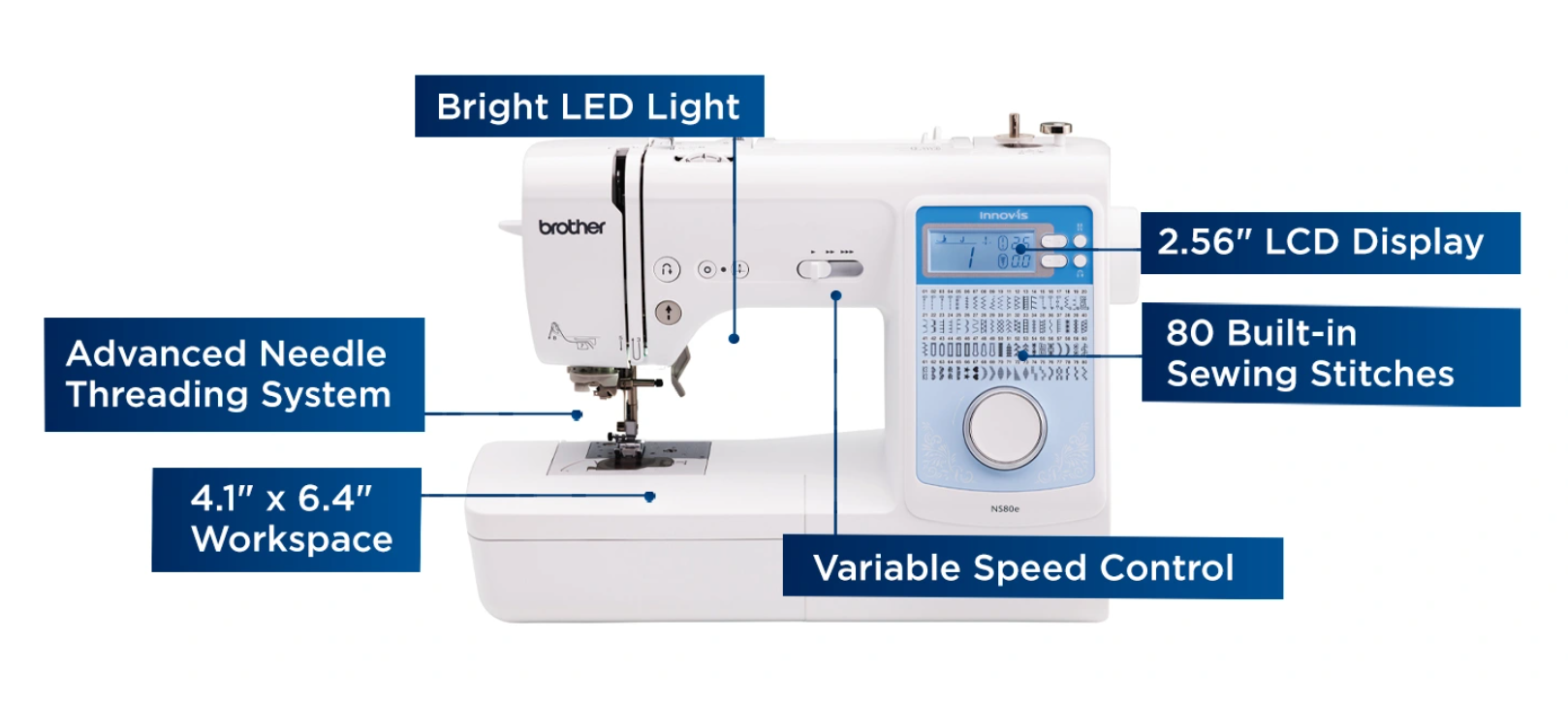 The Innov-ís NS80E packs a punch in a smaller footprint. This makes it an excellent option for traveling and sewing retreats. This machine offers exceptional sewing quality by using components from more technologically advanced sewing machines. The long J foot and feed dogs create a smooth sewing experience with consistent stitching. The advanced needle threading system and clear LCD screen make operation a breeze. This machine is perfect for new sewers, or for experienced hobbyists looking to expand their collection on-the-go. Looking for portable, feature rich and affordable? The NS80E is the machine for you.