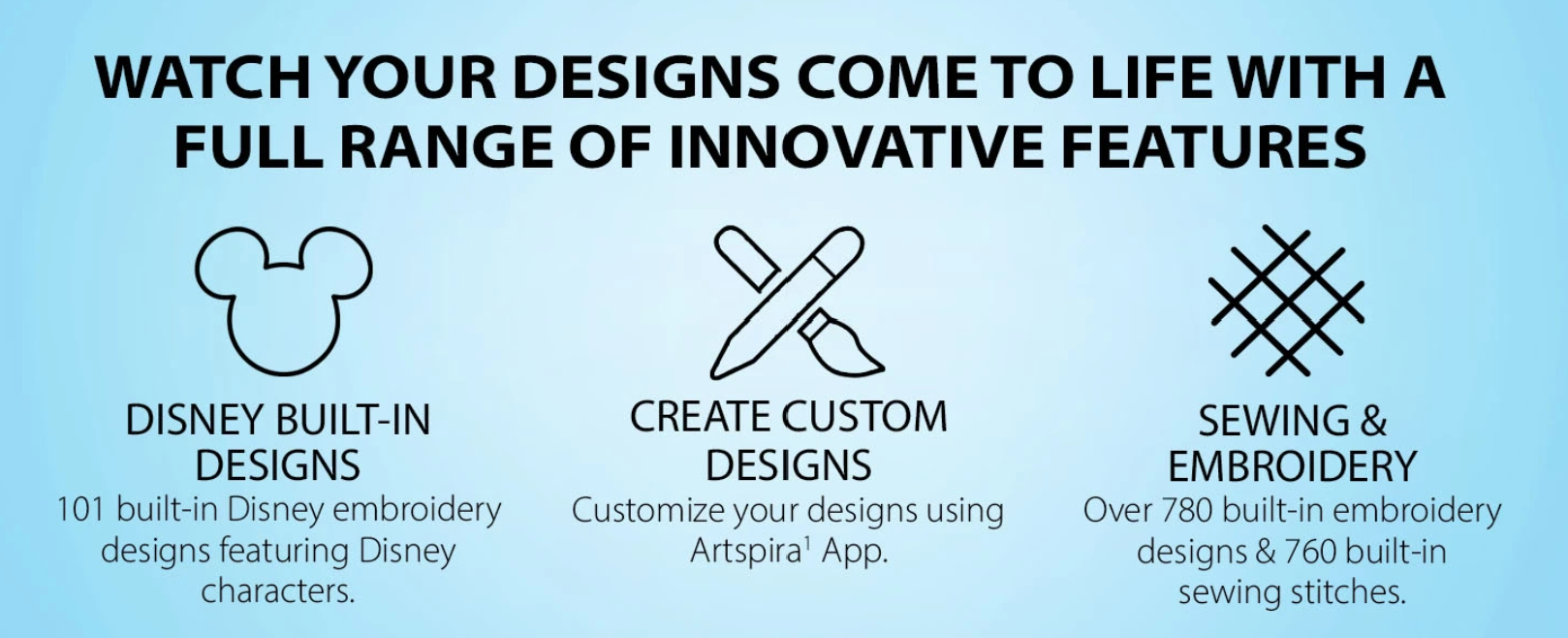 The modern Stellaire2 Innov-ís XJ2 Disney Combo Sewing and Embroidery machine continues the Brother legacy of exceptional combo machines. With 788 embroidery designs, plus 101 Disney-exclusive designs (for a total of 889), a large 9.5” x 14” embroidery area, and wireless integration with Artspira‡, the Stellaire2 Innov-ís XJ2 will elevate your sewing and embroidery skills.