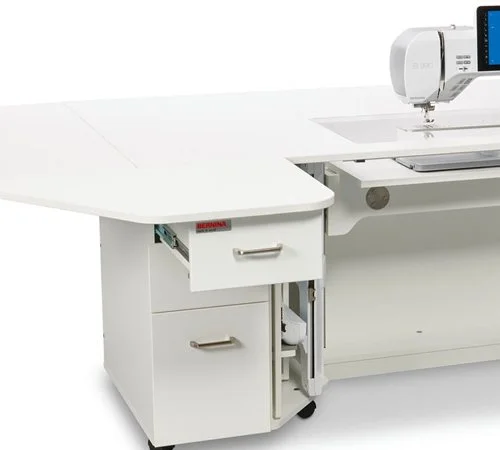 The 34" electric lift accommodates the largest machines on the market and allows the ultimate center of needle sewing position. The bottom cut-out allows more leg room to the left side of the sewing machine for the most comfortable sewing experience, and the added kick plate keeps the foot control from sliding underneath the cabinet.
