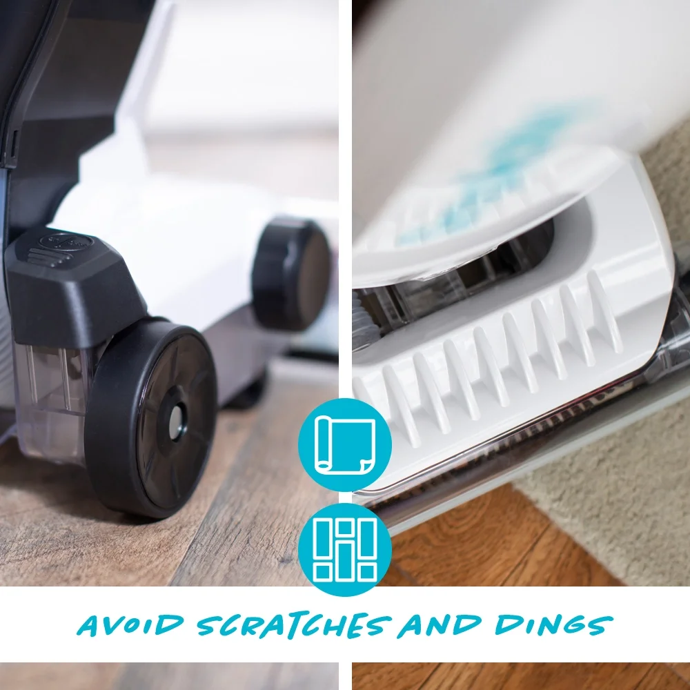 Rubber wheels and bumper guard help protect floors and baseboards.